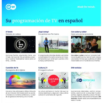 Deutsche Welle (DW) es la voz mediática alemana en el mundo. DW Español con 24h de televisión en español, es una señal especialmente diseñada para el público de América Latina. Presenta noticieros cada hora, debates y magacines que informan sobre la actualidad global y regional abriendo espacios para la controversia y diversidad de opiniones, el glamour, lo último en el mundo digital, la ciencia, el medio ambiente, los negocios y la música en vivo, con claves para mantenerse en forma y los mejores documentales desde todos los rincones del planeta. Con una mayor cobertura, más análisis y mejor programación, DW lleva al público latinoamericano televisión entretenidamente informativa.